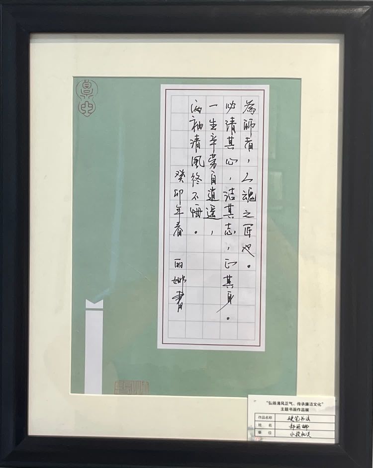 “清廉者,乃清正廉潔、大道直行、奉公守法也”“粉身碎骨渾不怕,要留清白在人間”“不要人夸好顏色,只留清氣滿乾坤”《清廉賦》、《石灰吟》、《墨梅》……一張張寫滿正氣的書法、一幅幅描繪廉潔的畫卷,傳遞著清正廉潔主旋律,弘揚著擔(dān)當(dāng)實干正能量。