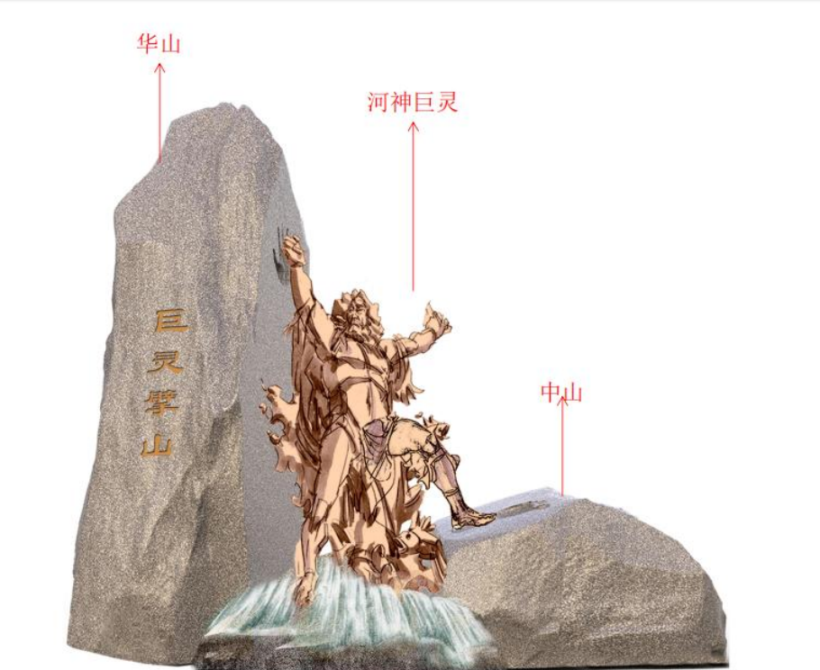 中條山古稱中山、襄山、首陽山,原本與華山連在一起,橫亙中原。黃河滾滾西來,被山擋住,橫溢泛濫,為禍天下。上天慈憫,委派河神巨靈,即擁有智慧的巨人,施展神通,以手掌擘開華山,足底蹬離中山;運(yùn)用大力,兩手一推,雙足一蹬,便將其一分為二,河水從中穿過,浩蕩東去。從此后,黃河西來決昆侖,咆哮萬里觸龍門。黃河之水天上來,奔流到海不復(fù)回。至今華山上仍有仙掌峰,留有巨靈神的掌?。皇钻柹较?,還印著巨靈神的足跡。中、華二山孕育誕生了中華民族,黃河母親哺育中華,滾滾東流,生生不息。到了《西游記》中,巨靈神成了三壇海會大神哪吒的先鋒,手持宣華斧,護(hù)持正道,無比威武。